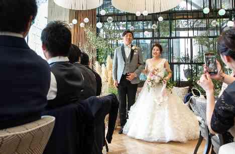 同じフロアの有名なボタニカルショップ「ガレージ」が挙式の舞台。木の床や椅子などアイテムもオシャレな演出になる空間です。お二人がMEDIに決めた理由のひとつがチャペルでした。緑にあふれた空間はアットホームな人前式にぴったり。父との入場や母からのベールダウン、くじ引きで読みあげた誓いの言葉...「全てが感慨深いシーンになりました。」と新婦様から嬉しいお言葉をいただきました。