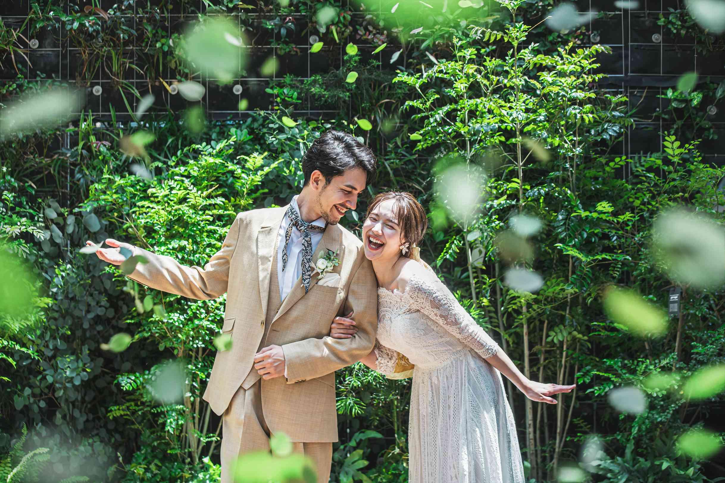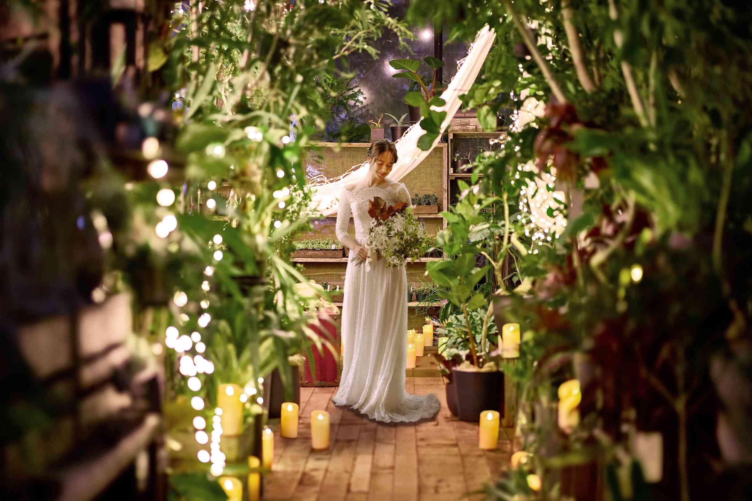 話題のボタニカルショップ「garage」を丸ごと貸切できるから、約100万円相当の本物の木々の中で神秘的な挙式が叶う。自然光が注ぐ、名古屋駅すぐの都会のオアシスを堪能できる贅沢チャペル。