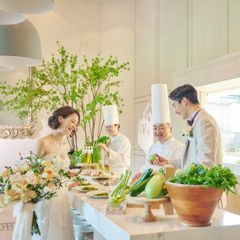 パーティー会場にあるオープンキッチンで炎の演出体験。ゲストへのおもてなしにも人気の演出をぜひ体感して。シェフが新鮮な食材で何か作ってくれることも…!