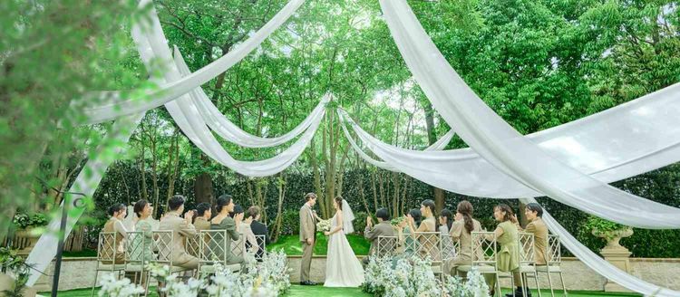 大宮璃宮では広大なガーデンだからこそまるでリゾートウエディングのようなガーデン挙式も叶う。ゲストと距離感近く過ごしたい、宗教色はいらない、今流行りのガーデン挙式がしてみたいという方におすすめ。緑溢れる中でゲストとナチュラルなウエディングを叶えて。
