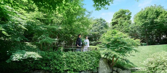 和装も映える日本の四季を感じられる庭園。もみじや桜の木もある洗練された空間。