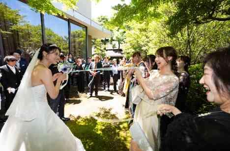 挙式後はおふたりがお選びされた貸切邸宅【オリエンタルテラス邸】にゲストをお招きしガーデンでのウェルカムパーティー!ご新郎様はゴムパッチンプルズ。ご友人を何名様かお呼びされゴムパッチンされた方にはプレゼントをお渡しされており、男性友人も大盛り上がり!ご新婦様はブーケプルスのご演出。リボンが繋がっていたゲストの方も他の方も大変盛り上がった演出でした。