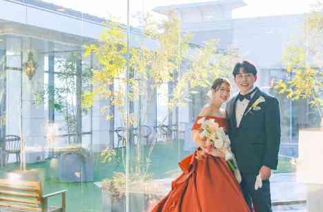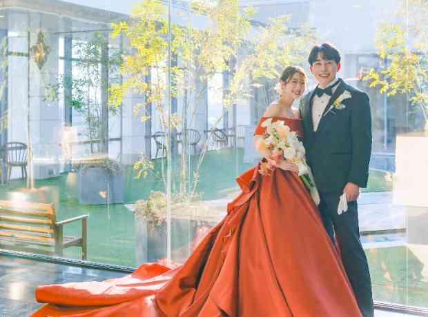 披露宴会場に隣接するプライベートガーデン。一目惚れしたテラコッタカラーのドレスが、青空と緑、そして眩い太陽の光に映えて、当日は想像以上に素敵な写真を残すことができました。ゲストからも「ドレスの色がすごく綺麗!」と大好評。開放的な空間で自然体の笑顔になれました。挙式後も見返したくなる、宝物のような一枚に。