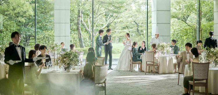 雨でも安心の全天候型チャペルは、自然光がやさしく降り注ぎ、緑が美しく映える特別な空間です。ゲストに囲まれながら、天候に左右されずに心温まる誓いを交わせます。光と緑に包まれたチャペルは写真映えも抜群で、挙式のひとときがより一層鮮やかに記憶に残ります。