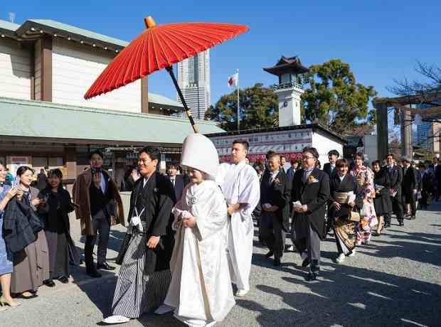 伊勢山皇大神宮の本殿で執り行われる神前式は、木の香りと雅楽の音が響く厳かな空間。青空の下、玉串奉奠や三三九度の儀が進むごとに、ふたりと家族の絆がより強く結ばれていきます。親御様の涙や参列者の静かな祈りが印象的で、古式ゆかしい美しさと感動に満ちた時間。神社の伝統に包まれながらも温かさあふれる挙式です。