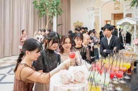 シャンパーニュ邸は、披露宴会場以外にもゆったりと過ごせるスペースをご用意。ゲストへはオリジナルカクテルのご提供も可能です。今回のおふたりは、とにかくかわいらしいドリンクでおもてなしをされたいとのことで、パステルカラーを使用したノンアルコールカクテルをご用意。ゲストは思わず写真を構え、待ち時間から楽しい時間をお過ごしいただけました。