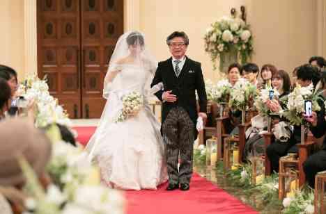本物のステンドグラス・赤い本格的なヴァージンロード・パイプオルガンの生演奏・・・。これらを選んだのは、何より自分たちの結婚式を楽しみにしており、感謝を特に伝えたい両親に感謝を伝えたかったからこそ。本物の空間にこだわったチャペルでは、荘厳な雰囲気で気持ちを伝えやすくなる。父親との入場シーンは、涙が溢れる時間となりました。