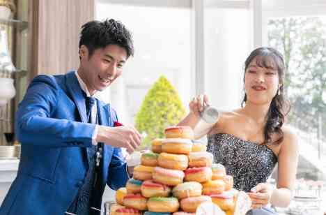 普通のケーキじゃ物足りない!ここは私たちらしく楽しい時間にしたい!というご要望に応えて、ドーナツケーキを作成。会場の彩りとしてもばっちり!ゲストからは歓声が上がります。おふたりが砂糖をドーナツにかければ、完成♪まずは互いに食べさせあったり、友人に食べさせたり・・・!ゲスト参加で楽しい時間となりました。