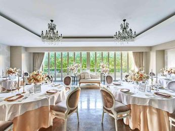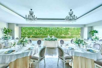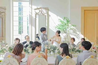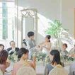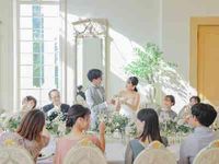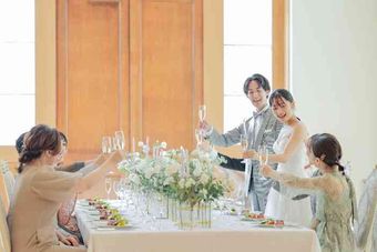 少人数だからこそ流しテーブルのレイアウトもおすすめ。お話しやすいレイアウトだからこそ会話も弾み会話に花が咲く。 ゲストとお食事を愉しみながら優雅な時間を過ごしたり、お写真もたくさん残して。