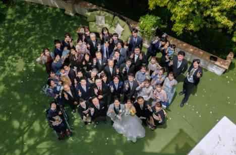 赤坂アプローズスクエア迎賓館は緑いっぱいのガーデンを貸切で使える会場。ゲストとガーデンで過ごす時間をたっぷりとりました。挙式の後はまずはガーデンでお二人がゲストをお出迎えし、今日来てくれた感謝の気持ちをを一人一人に伝える"ウェルカムフォトタイム"はゲストからも大好評。木漏れ日が差し込むガーデンでゲスト全員と一緒にアットホームな集合写真も撮影。