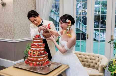 当館を選んだ一つの理由が"貸切で自由度が高い"こと。王道のケーキ入刀も、お写真映えだけでなく動画映えもするようにウエディングケーキにソースをドリップするドリップセレモニーを行いました。そのままゲストとのお写真撮影の時間も楽しんでいただき、ゲストとの時間を大切にするお二人らしい素敵な時間となりました。