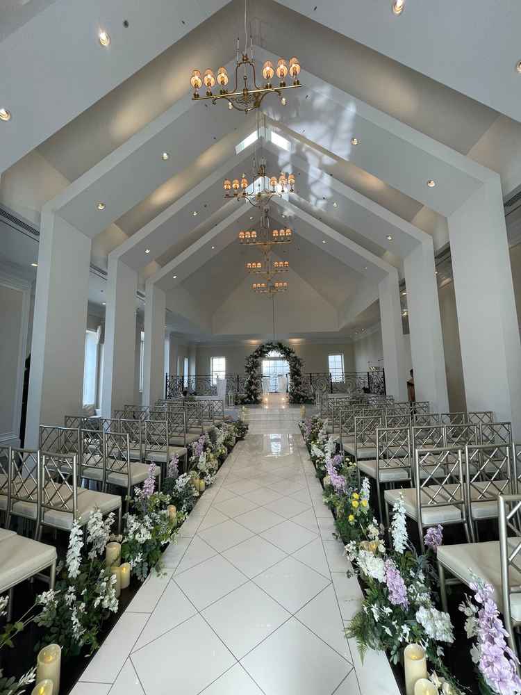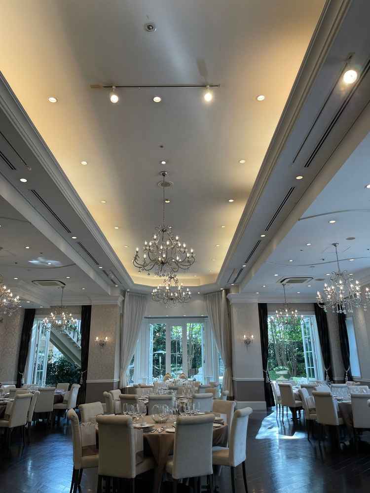 室内チャペルはカジュアルですが、自然を感じられてとても綺麗でした! 披露宴会場のシャンデリアはキラキラで高級感が溢れました。 お庭で海外風挙式もできるから憧れました。