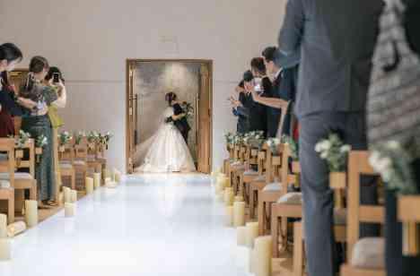 お母様からのベールダウンや、ゲストの皆様の名前が刻まれたゴールドの結婚証明書の完成、リングキッズのご登場など 和やかに そして感動的に進んだ人前式。 たいせつなゲストの皆様の笑顔で見送られ退場され、その扉が閉じる瞬間に おふたりが向き合い“クロージングハグ” 可愛らしいおふたりのハグする姿に会場は大盛り上がり!黄色い歓声とともに扉が閉まりました♡
