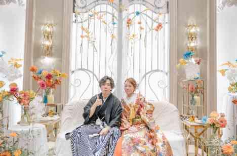 かわいく凛々しかったウエディングドレスとタキシードのお姿からのお色直しは…日本の伝統衣装である“紋付袴&色打掛”に! 会場見学時から「和装を着たい」とお聞かせいただいていた夢をかなえてくださったお二人、とってもお似合いでした♡ メインソファ装花のお花の色味はご新婦様の色打掛で使われている色からとり カラフルながらも統一感のあるかわいい仕上がりに!