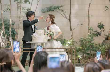 新郎新婦様のこだわりのウエディングケーキはトリフォーリアNAGOYAの専属パティシエが創り上げたオリジナル生ケーキ! 大理石の様な グレー×ホワイトのチョコプレートがあしらわれたお洒落なウエディングケーキには 胡蝶蘭が添えられ より華やかな印象となりました♡ 当会場の全天候型ガーデンテラスで行われたケーキセレモニーはとてもかわいいお二人のお姿にゲストの思わず笑顔に♡