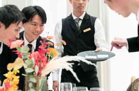 披露宴の全員参加演出“格付けチェック”を行いました!スタッフが手に持つお皿には“大根の桂剥き”が2つ置かれており じっくりと眺めてもらい「新郎様のお兄様がした“大根の桂剥き”」を当てるという超難問! 実は新郎様のお兄様は料理人をされており、会場見学時からお兄様にお料理を振る舞ってほしい とお伝えいただいていた夢がかなったシーンでした!