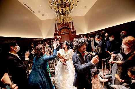 お二人の誓いや可愛らしいリングガールに温かく厳かに無事結ばれたかと思った挙式ですが なんと自撮り棒とスマートフォンを持った新郎新婦様とお子様が再入場!というゲストの皆様へのプチサプライズ 皆様の驚く顔や笑った表情を自らのスマートフォンに収めながらバージンロードをゆっくりと歩く新郎新婦 そして再退場は皆様からのコンフェッティシャワーで挙式の際の拍手とはまた違う華やかな退場を