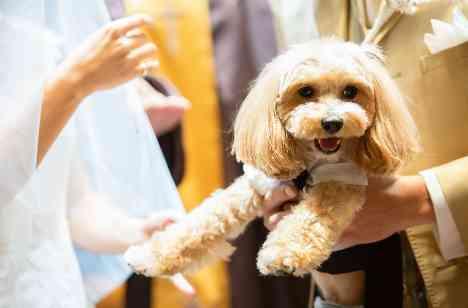 ジャズバンドの演奏が入り、楽しくも厳かに行われていくキリスト教式 新郎新婦指輪の交換で現れたのはなんとタキシードにおめかししたお二人のかわいいかわいい愛犬でした お二人の指輪がかかったネックレスを首に着けたリングドッグの登場に会場内が一気に癒されその瞬間笑顔で溢れました 無事新郎新婦まで指輪を届けられて一安心のわんちゃんでした