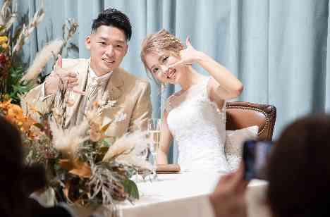 ご披露宴ではコーディネートからお二人のこだわりが伝わってきて高砂の装飾はゲストが写真を撮りたくなるようなオシャレなお花で装飾されておりました オレンジ色が散りばめられた会場装花は明るいお二人らしいコーディネートで、ゲストからも笑顔が出てくるような演出に会場内が終始笑顔に包まれておりました 挙式から披露宴入場までの新婦様のさりげないヘアチェンジもお洒落なお二人だからこそのこだわりでした♪