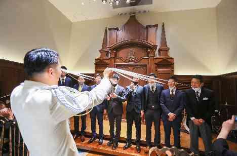 挙式は厳かに執り行われ感動的な時間となりました 挙式後にはお二人が再入場しブーケトスが行われました ブーケを無事キャッチした女性に会場内は拍手喝采! 終了かと思いきや…ゴムパッチンプルズが行われました ゲストはゴムを嚙み緊張して新郎手元に注目が集まります ゴムパッチンされなかった方が当たりのはずが全員がパッチン!すべて離してしまうというアクシデントがありましたが会場が笑いに包まれました