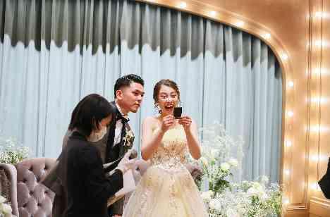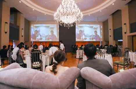披露宴ではゲスト思いなお二人からゲストへの演出がございましたが、そんなお二人へゲストからも様々なプレゼントがございました 新婦余興では新婦様のご友人からお二人に宛てたムービー上映とメッセージのプレゼントがございました その後の新郎余興では新郎様お勤め先の方々より制服を着られてのご余興と映像のプレゼントがございました 新郎新婦様も巻き込み会場全体が盛り上がるようなにぎやかなシーンとなりました