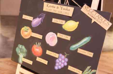 挙式前に「水合わせの儀」で使用するオリーブの木にゲスト様には土を入れて頂きました。紙コップには新婦様手作りのお野菜イラストのエスコートカードが。クリップなっているので皆様にはポケットなどにつけて頂き一体感を。テーブルの上には手作りのオシャレな席札が。カラフルに置かれたナフキンとの相性もあり楽しい空間を楽しんで頂きました。
