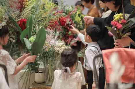 バンケットには会場装飾のように見えるたくさんの種類のお花が並んでおりました。おふたりがご中座の際に会場に流れたのは「ブーケコンテスト開催」の言葉。各テーブルの代表者様に新婦様が再入場時に持つブーケを作成して頂きました。優勝の発表は再入場時に、そして惜しくも選ばれなかったブーケは各卓の装飾として使用。お色直しの待ち時間も楽しい演出でした!
