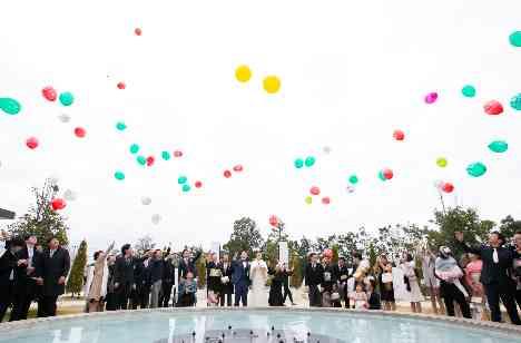 施設の良さをフルに使った、ゲストが羨むような結婚式にしたかったので、当日は挙式後のアフターセレモニーで噴水のまわりからゲスト全員でバルーンリリース。披露宴お色直し入場の時には、新郎は『U.S.A』、新婦は『め組の人』の音楽でらせん階段を降りてきて、ゲストと一緒に踊ったりしました。