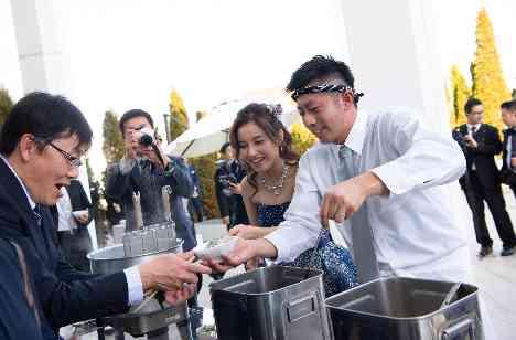 プライベートガーデンでのラーメンビュッフェ!!お2人自らがラーメン屋となりゲスト1人1人へ盛り付けと会話をしながらおもてなしをしていました!!オリジナリティー溢れる演出にゲストも大盛り上がり♪笑顔あふれるアットホームなパーティーになりました。