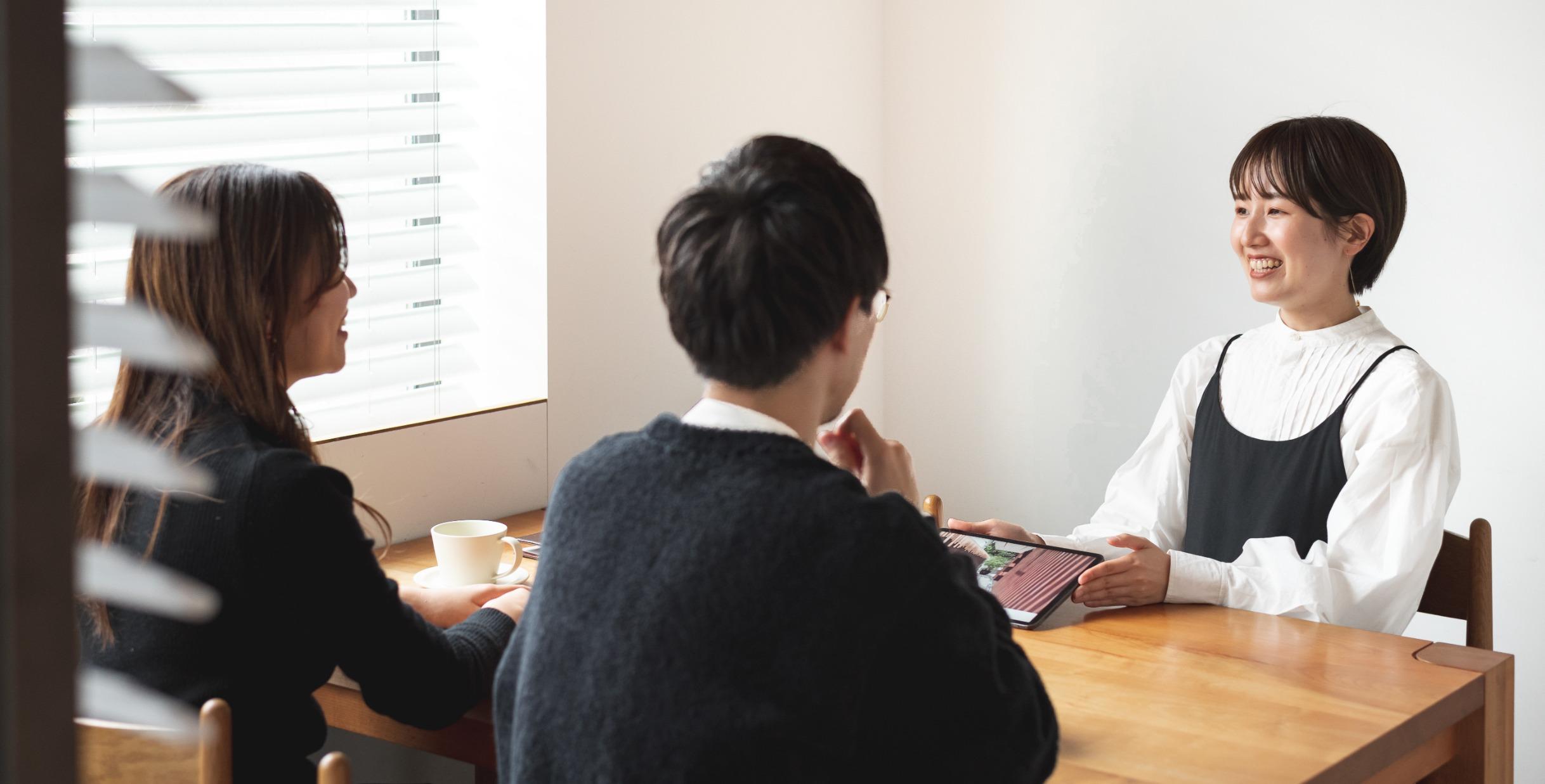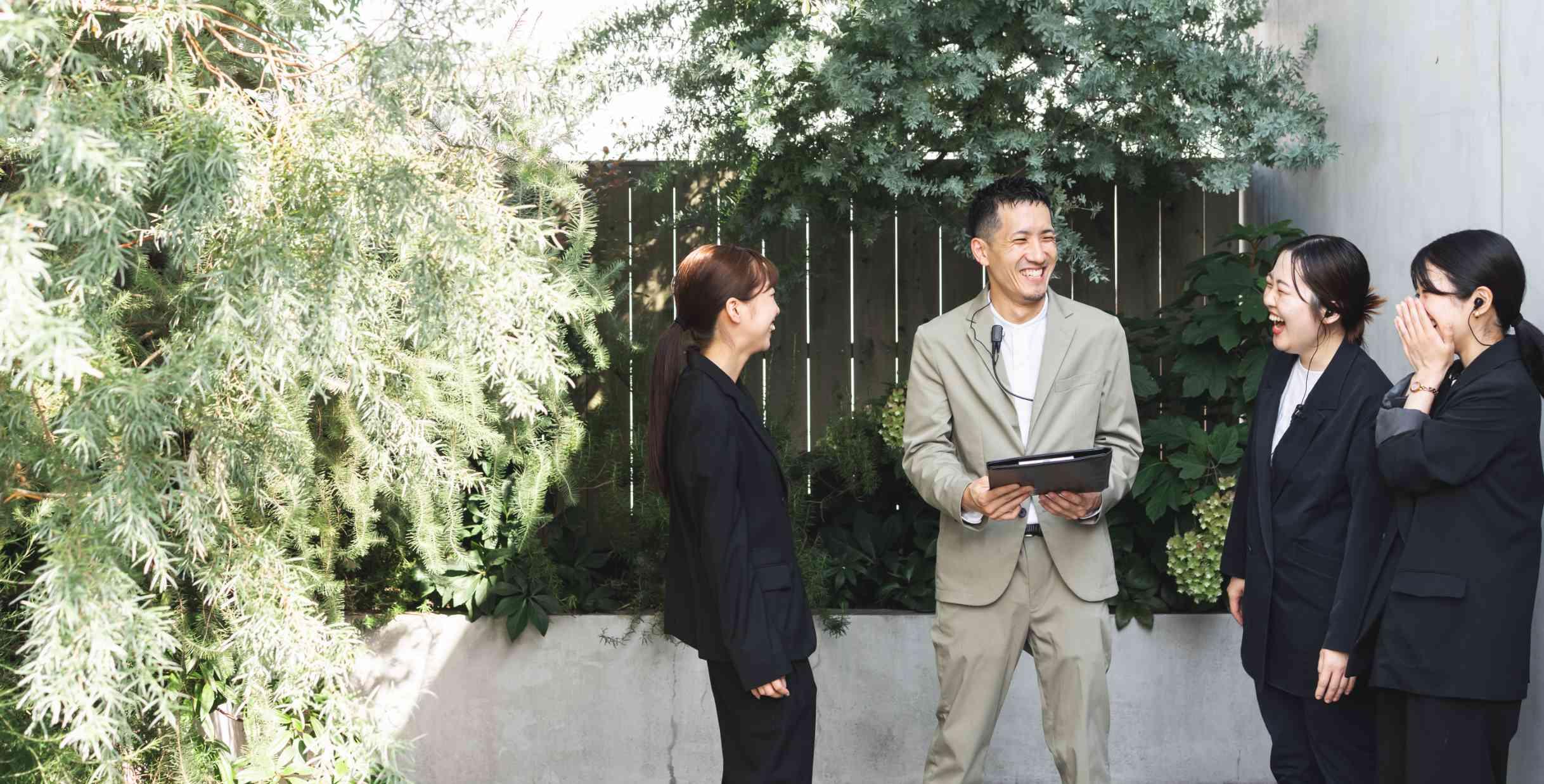 チャペルで神様に誓うではなく、IWAIは大切なゲストの前で誓う「人前式」スタイルです。 主役を中心に参加者が向かい合う構成。会場には季節の花が常設され、ふたりの誓いを見守ります。