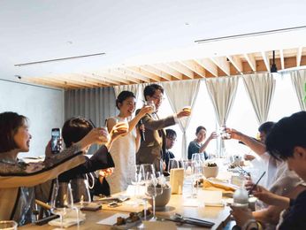 IWAIの結婚式には、高砂がありません。あるのは、ひとつのロングテーブルと、自由な過ごし方。すべては、大切な人たちと、近い距離で楽しい時間を過ごしてもらうために。お打ち合わせを伴走してきたプロデューサーが、当日の司会進行も行うので安心です。