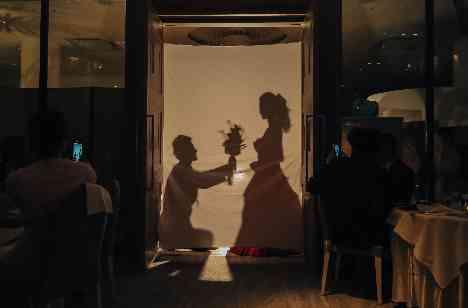 パーティの後半の再入場は、おふたりの姿が影で浮かび上がる「シルエット入場」!会場内はパーティ前半の明るい雰囲気から一転、夕暮れ時になり、照明を落として各テーブルにキャンドルを灯しました。素敵な雰囲気の中でおふたりがお色直しでガラッと印象を変えての再入場♪入場時からゲストを楽しませる演出で、会場内も盛り上がりました!