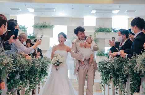 挙式のお時間は、家族3人からゲストの皆さまにご報告ができるように人前式のスタイルを選びました。 ご入場シーンはご新郎様がお子様と一緒にご入場し、ゲストも大興奮! ウエディングキスはお二人からお子様のほっぺへ。 結婚証明書は家族3人の手形スタンプで完成させました。家族のように温かく見守り仲良くしてくださったゲストの皆さまに新しい家族3人でご報告ができたアットホームな挙式になりました。