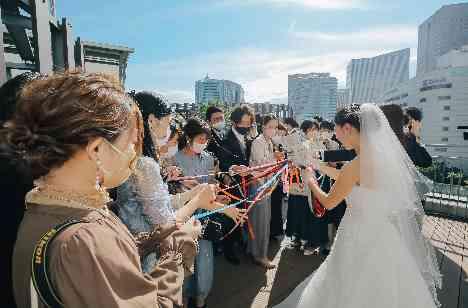 挙式後はゲスト全員をガーデンに招待し、参加型のセレモニーを行いました。 ブーケプルズを通した”幸せのおすそわけ”のセレモニーや、ゲストの皆さま全員と一緒に集合写真を撮ったりなど、ゲスト全員が参加し思い出を作れる時間となりました。 横浜の綺麗な空と街並みを背景にゲストの皆さま自身もお写真撮影を楽しまれており、全員の記憶に残るお時間になりました。