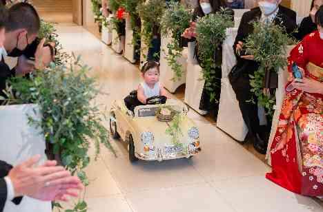 ラジコンカーに乗った可愛いリングガールが登場!永遠を誓うおふたりの元へ、一生懸命リングを届けます。その微笑ましい姿に、会場中に笑顔が広がります。陽光×生演奏の優しい音色に包まれたオリジナル人前式。おふたりらしく自然体で叶えることができました。挙式後は、開放感たっぷりの青空の下、全員一緒に集合写真を。