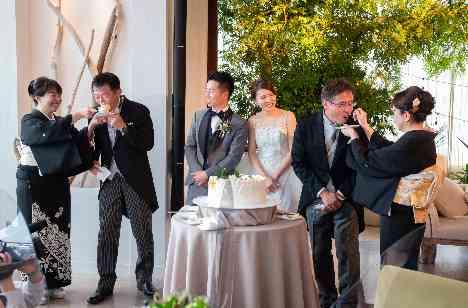 お父様からお母様へ、お母様からお父様へのお手本バイト。ご両親のように仲の良い夫婦になれるようにと、ファーストバイトのお手本を見せてもらう演出です。オープンキッチンからの出来立て料理や色鮮やかなデザートブッフェ…メイン卓をソファ席にして、ゆったりリラックスしながら、おふたりらしさが詰まったおもてなしが実現しました。