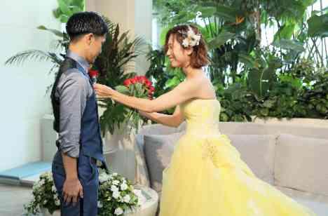 席札、席次表、テーブルナンバーなど沢山の手作りアイテムをご用意。 ご新婦様は「大好きな映画」から黄色のドレスが着たい試着時から仰っていました。とてもお似合いな黄色のドレスをお召になり、お色直し再入場。 ゲストテーブルに真っ赤なバラが1輪ずつ用意されていたものをご新郎様が集めて、ブーケに。 まるで「映画のワンシーン」のように、ブーケブートニア交換のセレモニー、とても素敵なシーンになりました。
