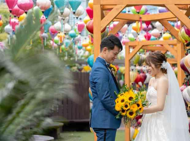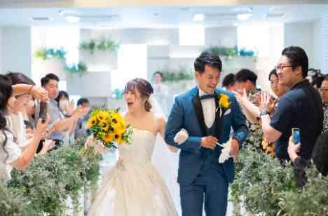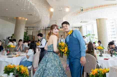 おふたりが選ばれた「ウィズザベイ」の会場は、大きな窓から差し込む太陽、植物、水を満喫できる全天候型パーティルームです。 ひまわりのブーケや、会場フラワー、カラードレスのブルーなど…夏の結婚式らしいトータルコーディネートがゲストにも大好評! 会場の噴水からは優しい水の音が心地よく、涼し気でもありおふたりの結婚式にぴったりでした。