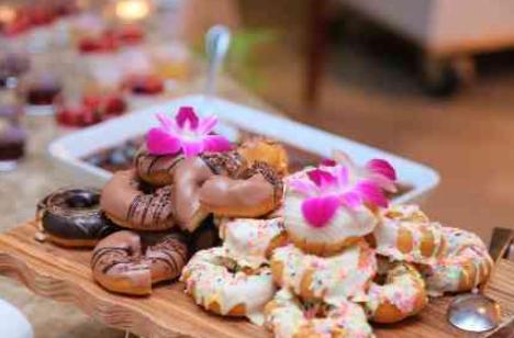 ゲスト同士も会話を楽しめるように、動きのある時間をつくりたいと考えていたおふたり。パーティ終盤にパティシエのパフォーマンスとともにデザートを楽しめる「ライブデザート」をご用意しました。歓声とともに席を立ち、笑顔で会話とデザートを楽しむゲストの表情が印象的でした。