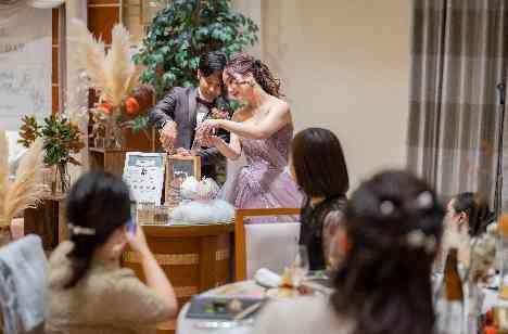 ゲストの記憶に残る楽しい式にしたい!と思い夫婦ともに好きなうさまるをたくさん散りばめました。サンドセレモニーやエスコートカード、ブーケトスの代わりにお菓子まきで、ゲスト参加型の演出を取り入れたことがとても喜ばれました。ファーストバイトも、新郎ではなく新婦が特大しゃもじでバイトしてので、ゲストからの驚きや、笑いを誘うことが出来ました。