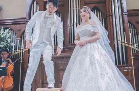 挙式の中でも、ゲストの笑顔を誘ったのは誓いのキスのワンシーン。背丈がほとんど同じおふたりらしく新郎がそっとビールの空き容器に乗って身長をプラス。その瞬間、会場には驚きと笑いが広がり、緊張感に包まれた空気が一気に和やかに。ふたりらしいユーモアあふれる演出に、ゲストからも温かい拍手が送られました。笑いと愛に包まれた誓いのキスは、きっと誰かの心にも残る特別なひとときに。