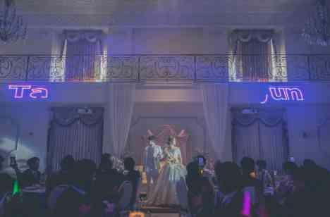 披露宴の幕開けとともに、会場内を包み込んだのは幻想的なレーザー演出。音楽に合わせて放たれる無数の光が空間を縦横に駆け巡り、一瞬で非日常の世界へと引き込みます。天井や壁一面に広がる光のラインが、ふたりの登場をよりドラマティックに演出し、まるでライブ会場のような高揚感に包まれました。ゲストからは自然と歓声が上がり、期待と興奮が一気に高まる瞬間に。光と音が一体となったその演出。
