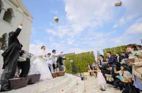 大階段でのフラワーシャワーを終えた後は新郎様の地元「名古屋」ではお決まりの“お菓子まき”!ゲストの皆様全員に幸せのお裾分けをしたいとの想いからご両親と共に行い、よりアットホームな挙式となりました!!!
