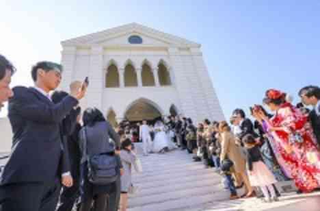 海外的な大階段では、フラワーシャワーも感動的に☆ ゲストの皆様も、お2人が出てきた瞬間、おぉ!!と喜ばれていました☆空とチャペルしかない空間は、ゲストの皆様にも特別な時間をご提供できます。お写真映えも◎