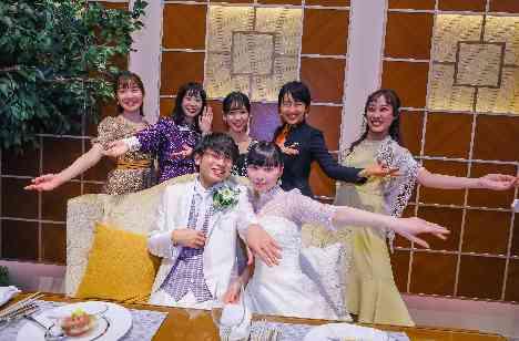 ゲストの皆さまがテーブルごとにおふたりのお席に集まって、 二人が選んだポーズでの写真撮影!! ポーズにも思い出が詰まっているからこそ、 たくさんの表情を見ることができ 個性あふれるお写真が記念に残せました!