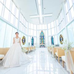 青空の見えるガラスキューブのチャペルで入場体験!親子3人で歩める2.5m幅のバージンロードは必見!空と光が彩る開放的な空間で、感謝を伝える感動のシーンを本番さながらに体感してください。