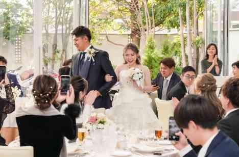 披露宴は実際始まってみるとあっという間でした。入場はガーデンから入場行ったので、みんな驚いてくれていました。当日は天気が良かったため、ガーデンからの入場は写真映えして良かったです。お色直し後の入場は階段から行いました。色んな所から入場出来たのでゲストからも好評でみんなが盛り上がってくれて嬉しかったです。