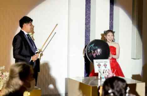 "ジェンダーリビールバルーン"でお腹の中の赤ちゃんの性別をゲストの皆様に発表しました。ゲストの皆様も驚いてくれて披露宴の中でも一番の盛り上がりでした。私達だからこそ出来る演出だったのでやって良かったです。凄く思い出の残りました。これから生まれてくる子供が大きくなった時にはこの時の写真を見せてあげたいです。