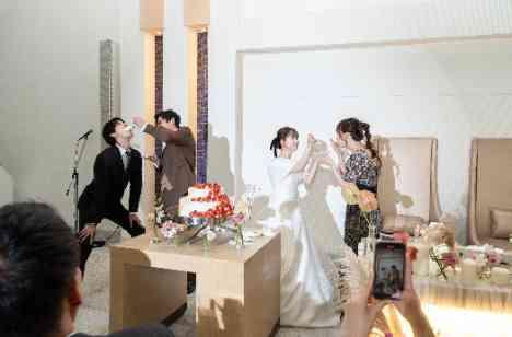 披露宴の中で行われたサンクスバイトは、おふたりの感謝の気持ちがまっすぐ伝わるあたたかな演出。これまで支えてくれた大切なご友人様をお呼びし、ケーキを食べさせるその姿に、会場からは自然と笑顔と拍手が広がりました。照れながらも嬉しそうにされているご友人様の姿がとても印象的で、思いがしっかり伝わる心温まる演出でした。