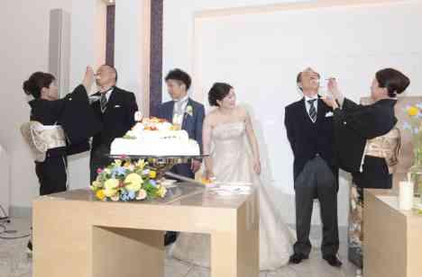 披露宴の人気演出の一つ、ファーストバイトは新郎新婦様お互いにケーキを食べさせあいをしました。 新郎様は大きなお口を開けて新婦様がすくわれたケーキをほおばっていました。 これでファーストバイト終わり、、、と見せかけて、サプライズでご両親様にもお手本バイトをして頂きました。 お二人の前で経験豊富なご両親様がお手本をおこなわれとても上手でした。
